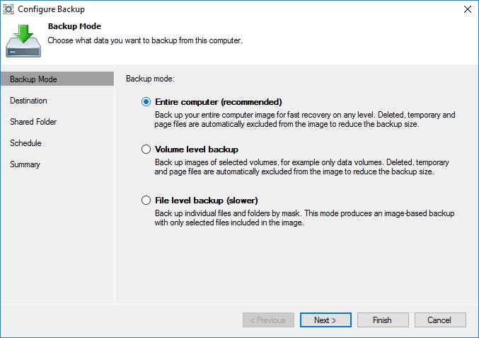 Je bent nu klaar voor de eerste back-up. Open de beheermodule van Veeam en ga naar Status / Configure backup. Je kunt hier kiezen tussen het back-uppen van de volledige pc, van één of meer specifieke volumes en van bepaalde mappen of bestanden. We raden je aan de eerste optie te kiezen. Vervolgens duid je de bestemming aan. Idealiter bewaar je de back-ups op een NAS, of minstens op een netwerkshare waar je als (netwerk)beheerder toegang toe hebt, zodat je de back-ups af en toe kunt controleren. Ten slotte vul je nog de gewenste back-upfrequentie en -voorwaarden in (bijvoorbeeld When backup target is connected). Leg je wijzigingen vast met Save en met Finish.