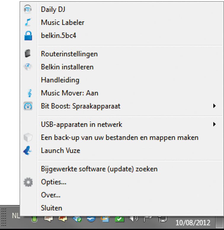 Als uw internetrouter een beperkte webinterface heeft, bent u verplicht om software te installeren om alle functies te kunnen benutten. Bij de Belkin Play Max-router is dat bijvoorbeeld het geval. Het voordeel van een aparte installatie is de gebruiksvriendelijkheid. De Belkin-installatie plaatst een pictogram in de taakbalk rechts onderaan. Een rechtsklik erop toont in één keer alle instellingen die u kunt veranderen (zie afbeelding).