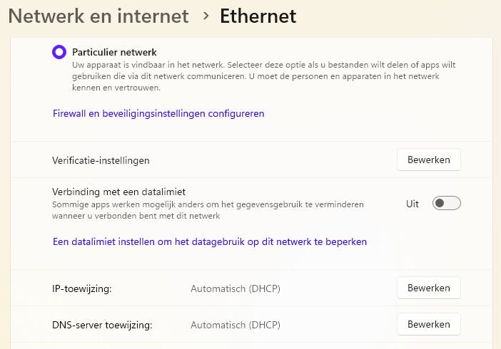 Zorg ervoor dat je netwerkapparaten automatisch de DNS-servers van de router overnemen. Dit gaat het makkelijkst als de DHCP-server op je router is ingeschakeld (wat meestal het geval is), en als ip- en DNS-toewijzing op je apparaten automatisch via DHCP verloopt. In Windows 11 vind je deze opties bij Instellingen / Netwerk en internet, waarna je Wi-Fi / Hardware-eigenschappen en/of Ethernet kiest.