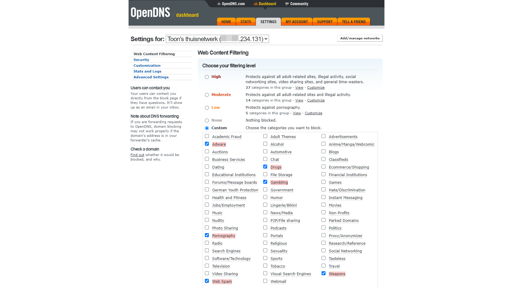 Open het tabblad Settings in je dashboard, klik op je ip-adres en kies Custom bij Choose your filtering level. Hiermee bepaal je zelf welke van de ongeveer zestig filtercategorieën je wilt activeren door een vinkje te zetten. Voorbeelden zijn Weapons, Adware, Drugs, Gambling, Pornography en Web Spam. Bevestig met Apply.