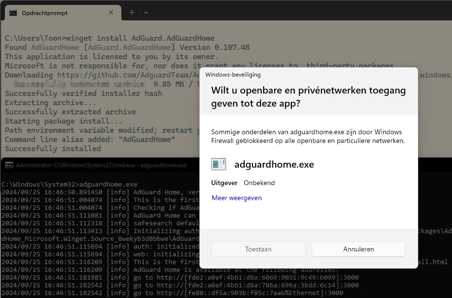 Sluit na de download en installatie de Opdrachtprompt. Start deze nogmaals op met administratorrechten en voer adguardhome.exe uit. Negeer de commando’s in het Opdrachtprompt-venster, maar laat hem geopend. Krijg je een melding van je (Windows-)firewall, klik dan op Toestaan voor de benodigde netwerkverbindingen.