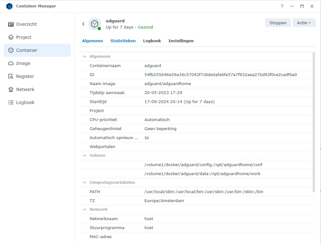 AdGuard Home, via Container Manager geïnstalleerd op een Synology-NAS.