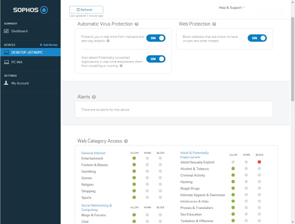 Klik je op een systeem, dan komt pas de ware kracht van Sophos naar boven. Als beheerder bepaal je per systeem welke beveiliging actief moeten zijn: real-timebescherming tegen malware en zero day-aanvallen, detectie van PUP's (potentieel ongewenste software) en/of blokkade van malafide sites. Er zit zelfs een module voor ouderlijk toezicht bij waarbij je aangeeft welke (van de 28) sitecategorieën al dan niet zijn toegelaten of bij welke een waarschuwing moet verschijnen. Verder kun je nog een systeemscan uitvoeren en uitzonderingen definiëren (sites of applicaties die alsnog moeten toegelaten worden of mappen of bestanden die buiten de viruscontrole moeten blijven). Je krijgt tevens een overzicht van de gebeurtenissen, zoals malwaredetecties en -verwijderingen of geblokkeerde sites.