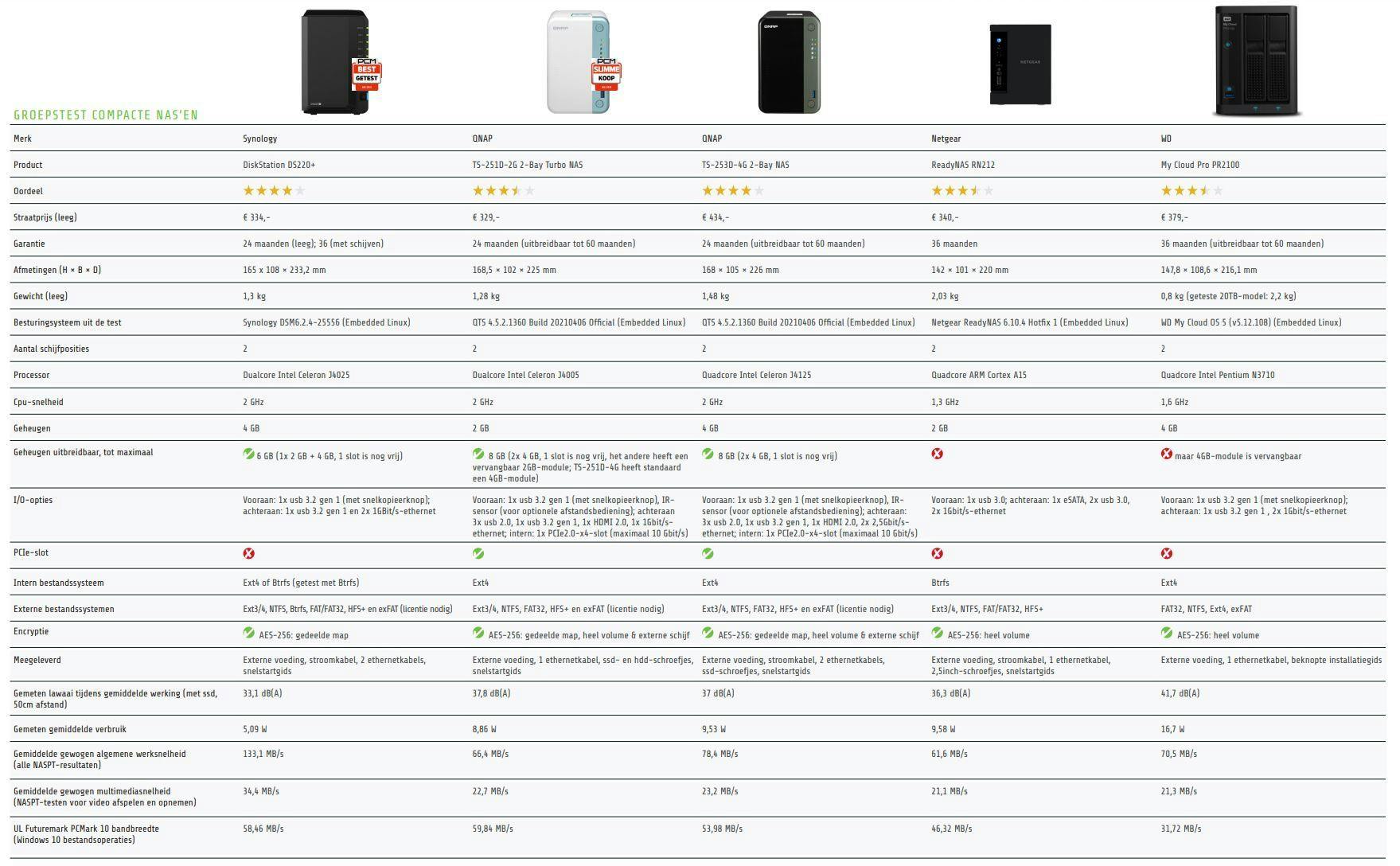 Om dit vlot te laten verlopen, is soms wel een uitbreiding van het geheugen tot minstens 4 GB nodig. Vooral voor de Intel-gebaseerde apparaten is 2 GB eigenlijk te weinig en kies je het best direct voor de versie met meer geheugen. De best presterende nas en winnaar van het keurmerk Best Getest is de Synology DiskStation DS220+. De QNAP TS-251D krijgt het keurmerk Slimme Koop, maar investeer als het kan direct in het model met 4 GB geheugen.