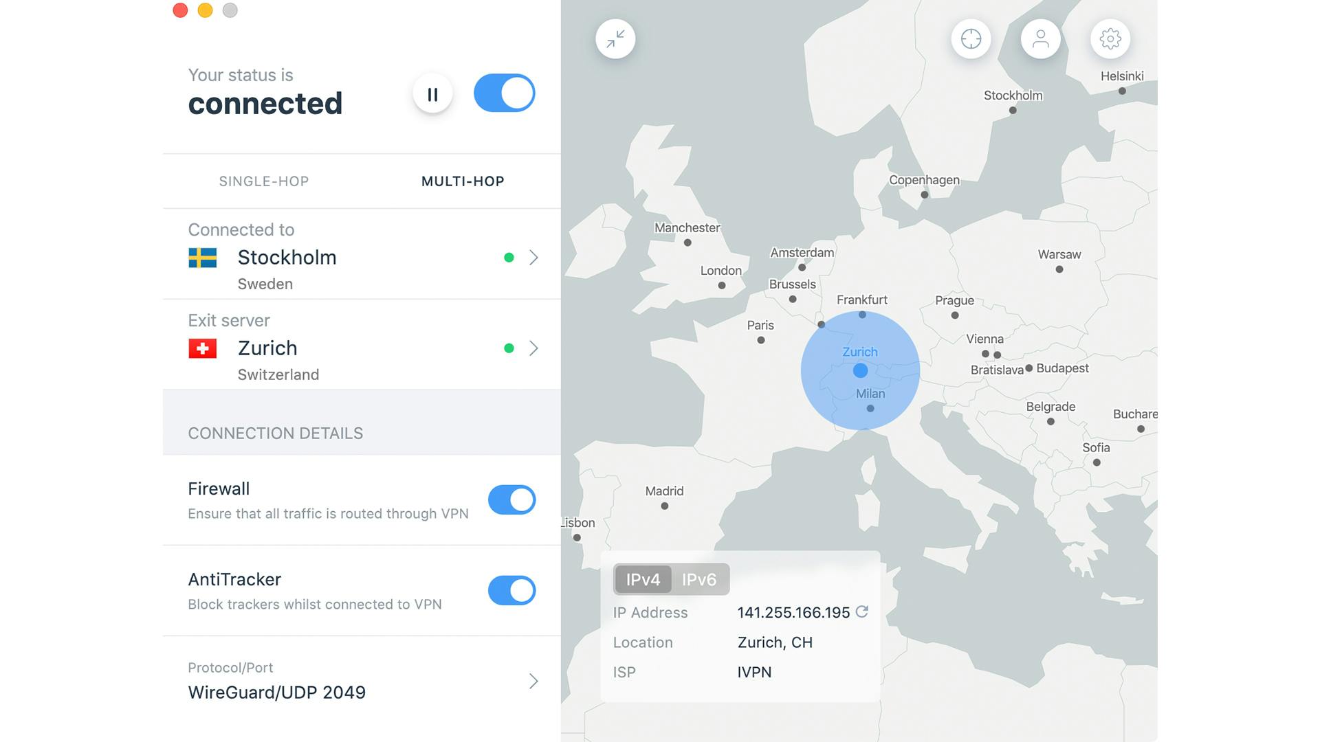 Verbinden gaat eenvoudig en bij de serverkiezer kun je zelf multihop-combinaties samenstellen. Daarmee kies je de server waarmee jij direct verbindt en waar het eindpunt boven water komt. Het samenstellen van deze combinaties is redelijk uniek.