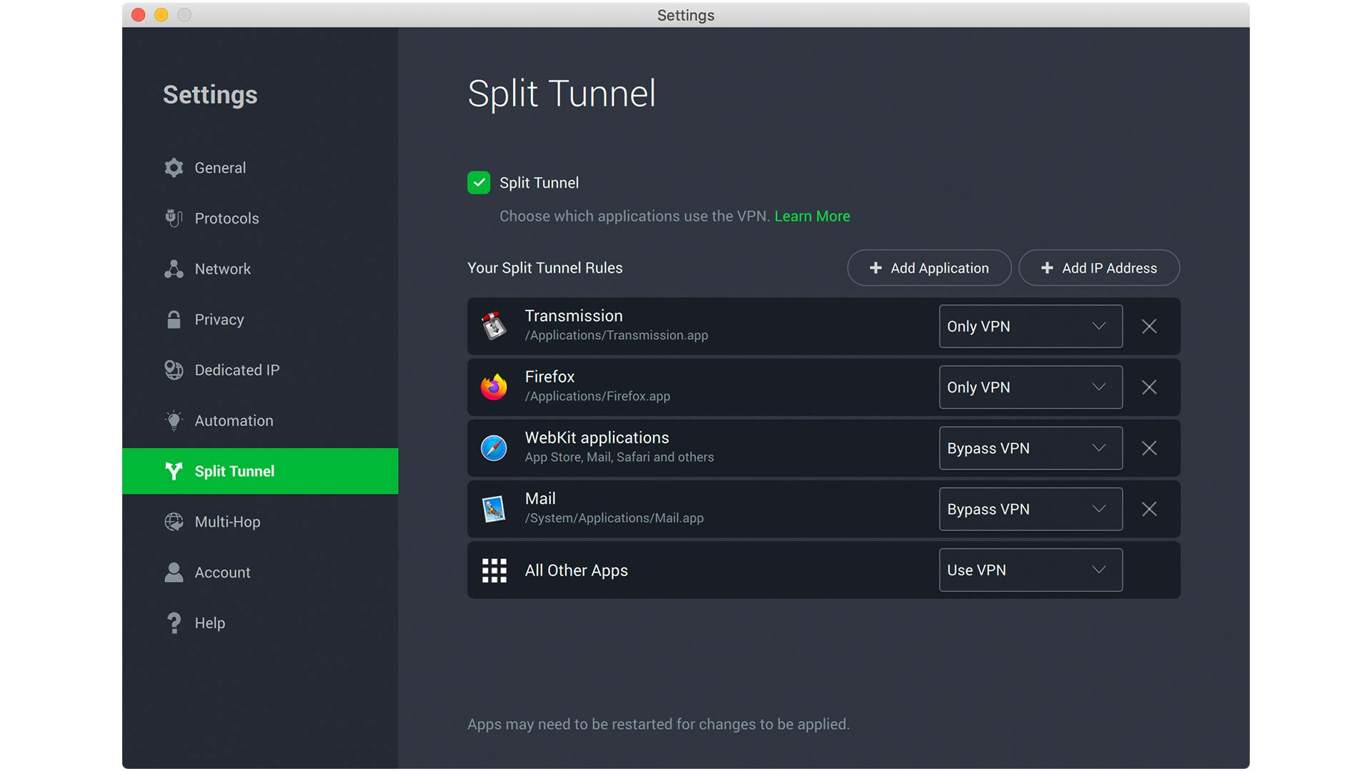Gelukkig kan je met de Windscribe-app wel instellen dat bepaalde applicaties wel of juist geen gebruik moeten maken van het VPN. Een functie die we bij veel providers missen.
