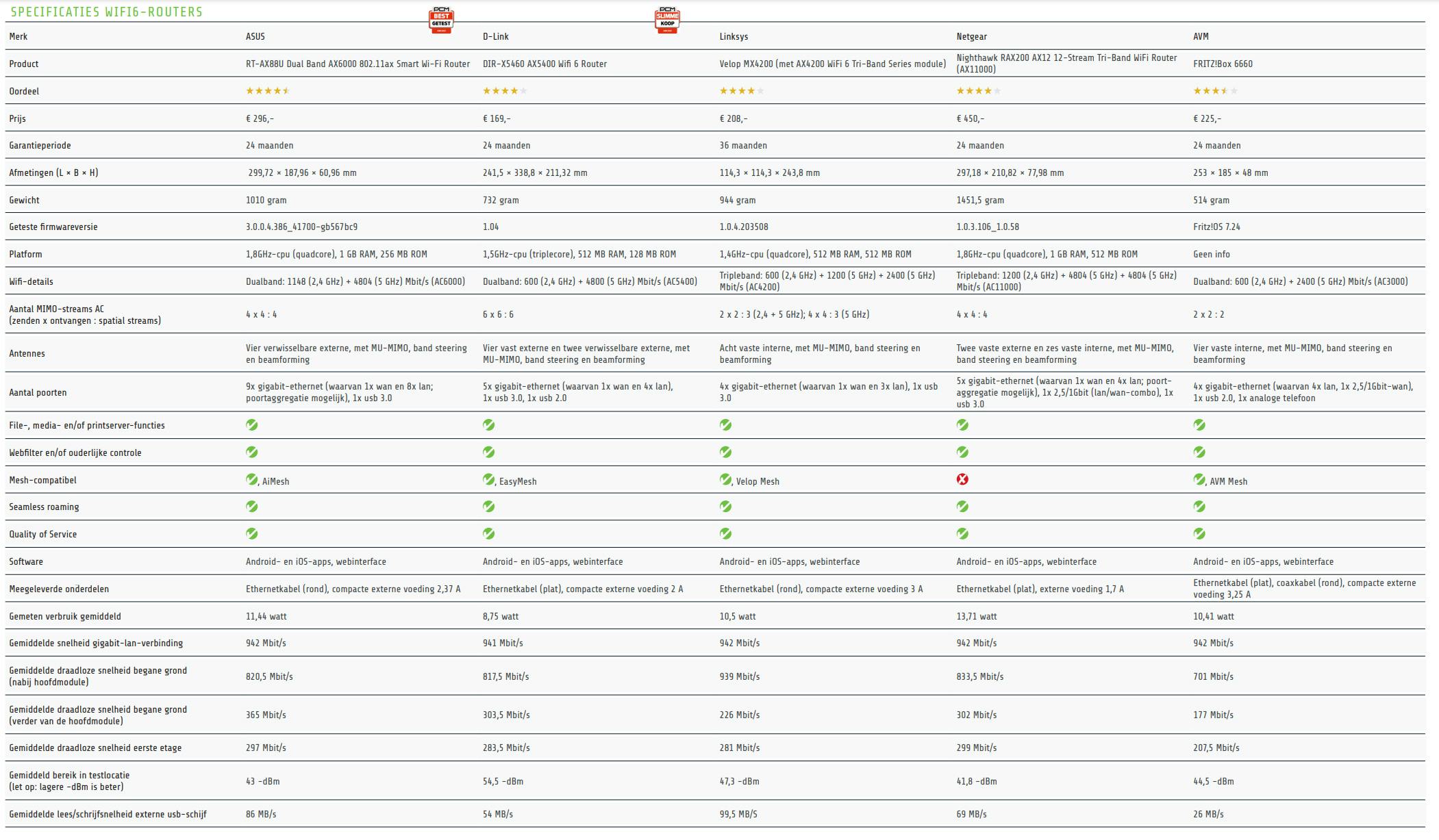 Nu weet je wat wifi 6 precies inhoudt en wat je er aan hebt. Bekijk hieronder alle testresultaten (klik op de afbeelding voor groter beeld), daarna gaan we op de individuele routers in.