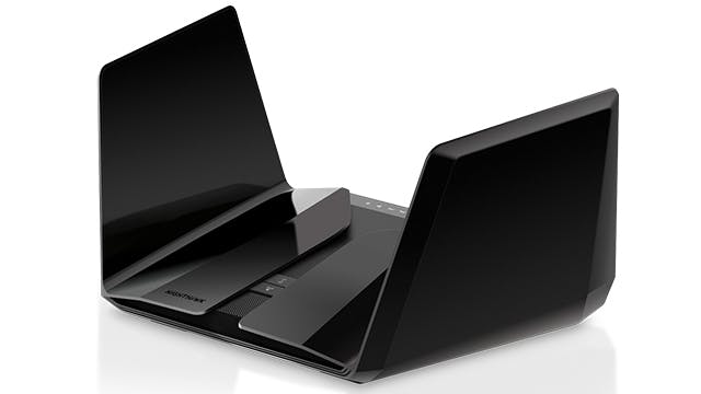 De RAX200 heeft drie wifi6-modems met een gecombineerde draadloze snelheid van 11.000 Mbit/s. De acht interne antennes zijn gemonteerd in twee grote vleugels die bij het uitpakken plat op de behuizing liggen. Die dien je eerst open te klappen. Het resultaat is een redelijk forse en zware router met het uiterlijk van een Amerikaans stealth-vliegtuig. Ook de externe voeding is behoorlijk fors.
