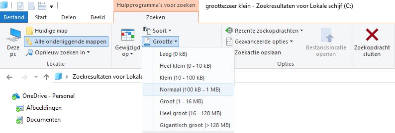Meerdere criteria tegelijk selecteren kan ook gewoon. Zodra je een zoekfilter kiest, zorgt Windows dat er in het zoekvak gelijk de de juiste syntax verschijnt. Kies je bijvoorbeeld Grootte / Klein en Gewijzigd op / Deze week dan verschijnt daar grootte:klein gewijzigdop:deze week. Let wel, kies je een criterium uit de rubriek Andere eigenschappen, bijvoorbeeld Bestandsextensie, dan verschijnt in het zoekvak weliswaar bestandsextensie: maar je moet dit zelf nog met de gewenste extensie aanvullen (bijvoorbeeld bestandsextensie:docx).