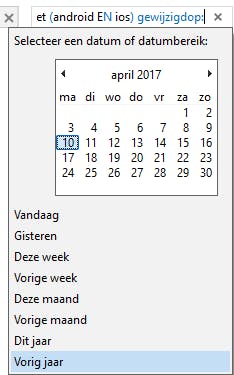 Ook complexe combinaties van meerdere zoekfilters zijn mogelijk. Je wilt bijvoorbeeld bestanden die vorig jaar of dit jaar het laatst werden gewijzigd, met de extensies docx of xlsx, maar die níet zowel de zoektermen Android als iOS bevatten. Deze zoekopdracht kan er dan als volgt uitzien: NIET (android EN ios) gewijzigdop:(dit jaar OF vorig jaar) type:(docx OF xlsx).
