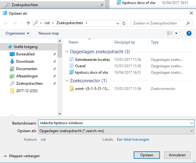 Maak je regelmatig gebruik van dezelfde zoektermen en filters, dan kan is het handig om die zoekopdrachten te bewaren. Op het tabblad Zoeken vind je in de rubriek Opties alvast de Recente zoekopdrachten terug. Maar om er zeker van te zijn dat een bepaalde zoekopdracht bewaard blijft, selecteer je hier Zoekactie opslaan. Standaard wordt de zoekopdracht als naam van het zoekbestand (.search-ms) overgenomen, maar dat is geen verplichting. Zodra je de zoekactie hebt bewaard, kun je die map – standaard is dat c:\users\<gebruikersaccount>\zoekopdrachten – bijvoorbeeld vanuit het contextmenu vastmaken aan de rubriek Snelle toegang (bovenaan in het navigatiepaneel), zodat je veelgebruikte zoekacties altijd snel bij de hand hebt.
