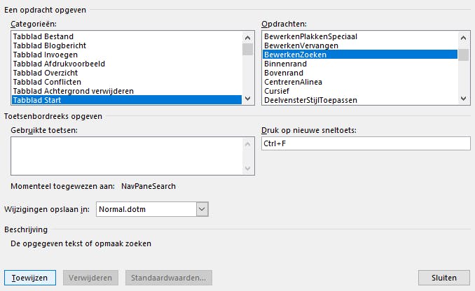Al sinds Word 2010 leidt de sneltoets Ctrl+F je niet langer naar de geavanceerde zoekfunctie, maar open je hiermee een eenvoudige zoekmethode in het Navigatiepaneel. Heb je dat liever anders? Open dan het menu Bestand en kies Opties. Ga naar de rubriek Lint aanpassen en klik onderaan links op Aanpassen, bij Sneltoetsen. Vervolgens klik je in het linkerpaneel op Tabblad Start en in het rechterpaneel op het item BewerkenZoeken. Klik in het vak bij Druk op nieuwe sneltoets en druk op Ctrl+F. Je krijgt een melding dat die al aan het navigatiepaneel is toegewezen, klik op Toewijzen om de aanpassing alsnog door te voeren. Wil je dat naderhand toch weer ongedaan maken, dan koppel je de sneltoets weer aan het item NavPaneSearch.