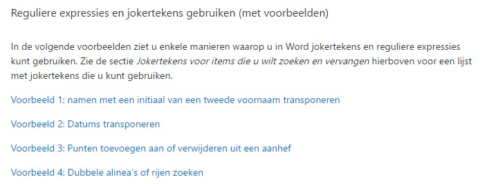 De zoek- en vervangfunctie in Word ondersteunt uiteraard ook de traditionele jokertekens, waarbij een vraagteken (?) staat voor één willekeurig teken en een asterisk (*) voor een onbepaald aantal willekeurige tekens. Zoek je naar tr??s, dan zouden dus onder meer trots en trucs gevonden worden. Een zoekterm als tr*s zou bijvoorbeeld ook tros, trots, trucs en iets als tralievenster naar boven halen. Je moet dan wel eerst een vinkje plaatsen bij Jokertekens gebruiken. Dit laatste geldt trouwens ook wanneer je reguliere expressies, kortweg regex, wilt inzetten. Deze syntax is zo uitgebreid en complex dat we hier niet de ruimte hebben om er dieper op in te gaan. We geven je wel een eenvoudig voorbeeld. Stel, je hebt duizendtallen gescheiden door een punt en je vervangt die liever door een spatie (van 1.234.000 naar 1 234 000 dus). Dat kan wanneer je ([0-9]).([0-9]) invult bij Zoeken naar: en \1^s\2 bij Vervangen door. Meer voorbeelden, zowel voor jokertekens als regex vind je onder meer hier.