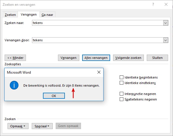 De zoek- en vervangfunctie laat zich ook op een wat creatievere manier inzetten. Je kunt hem bijvoorbeeld gebruiken om uit te vissen hoeveel keer een bepaald woord in je document voorkomt. Zowel bij Zoeken naar als bij Vervangen door vul je dan het betreffende woord in en zodra je op Alles vervangen drukt verneem je het aantal ‘vervangingen.