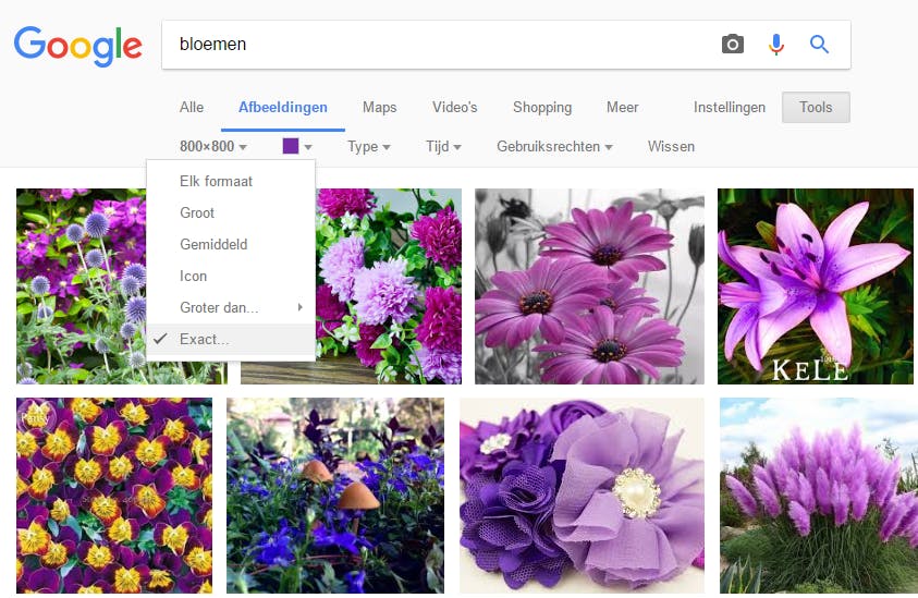 Ook bij Google Afbeeldingen tref je een hele reeks extra zoekfilters aan die zich niet in de syntax reflecteren maar in een apart balkje onder het zoekvak beschikbaar komen. Hiermee is het bijvoorbeeld perfect mogelijk uitsluitend naar (vierkante) plaatjes van exact 800x800 pixels te speuren, waarin de kleur paars overheerst. Vanuit het bijhorende zoekformulier kun je echter niet aangeven dat je afbeeldingen van een exacte grootte wilt. Dat kan wél door in de filterbalk onder het zoekvak Grootte / Exact aan te klikken en de gewenste pixels in te vullen bij Breedte en Hoogte. Is die filterbalk niet zichtbaar, druk dan eerst op de knop Tools rechts onder de zoekbalk.