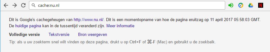 Wat doe je als je iets op een website wilt zoeken die blijkbaar net een upgrade heeft gehad zodat je de verwachte inhoud niet langer terugvindt? Dan vind je die wat oudere pagina wellicht nog terug in Googles cache, met de opdracht cache:[url]. Naar specifieke termen zoeken binnen zo’n gecachete pagina doe je met de sneltoets Ctrl+F.