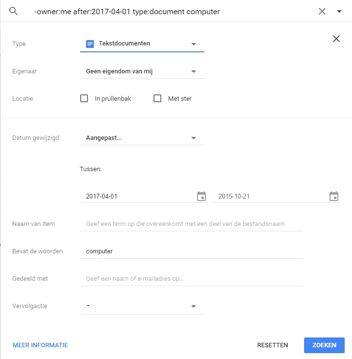 Cloudopslagdiensten als Google Drive, OneDrive en Dropbox zijn immens populair. Elk van deze diensten biedt zijn gebruikers uiteraard de mogelijkheid om binnen de bewaarde gegevens te zoeken. De zoekfunctie van Google Drive bereik je via de zoekbalk bovenaan. Zodra je die aanklikt verschijnt nog een uitklapmenu waarin je kunt aangeven binnen welke rubriek je wenst te zoeken, zoals Tekstdocumenten, Spreadsheets en Foto’s. Je kunt nog meer zoekfilters activeren wanneer je het pijltje rechts van de zoekbalk aanklikt. Hier leg je niet alleen het documenttype vast, maar ook de periode en eventueel met wie je het document hebt gedeeld. De bijhorende – Engelstalige – zoeksyntax lees je dan af in het zoekvak (bijvoorbeeld iets als computer -owner:me after:2017-04-01 type:document, wat zich laat vertalen als: zoek naar alle tekstdocumenten waarin het woord computer voorkomt, waarvan ik zelf niet de eigenaar ben en dat het laatst werd gewijzigd na 31 maart 2017).