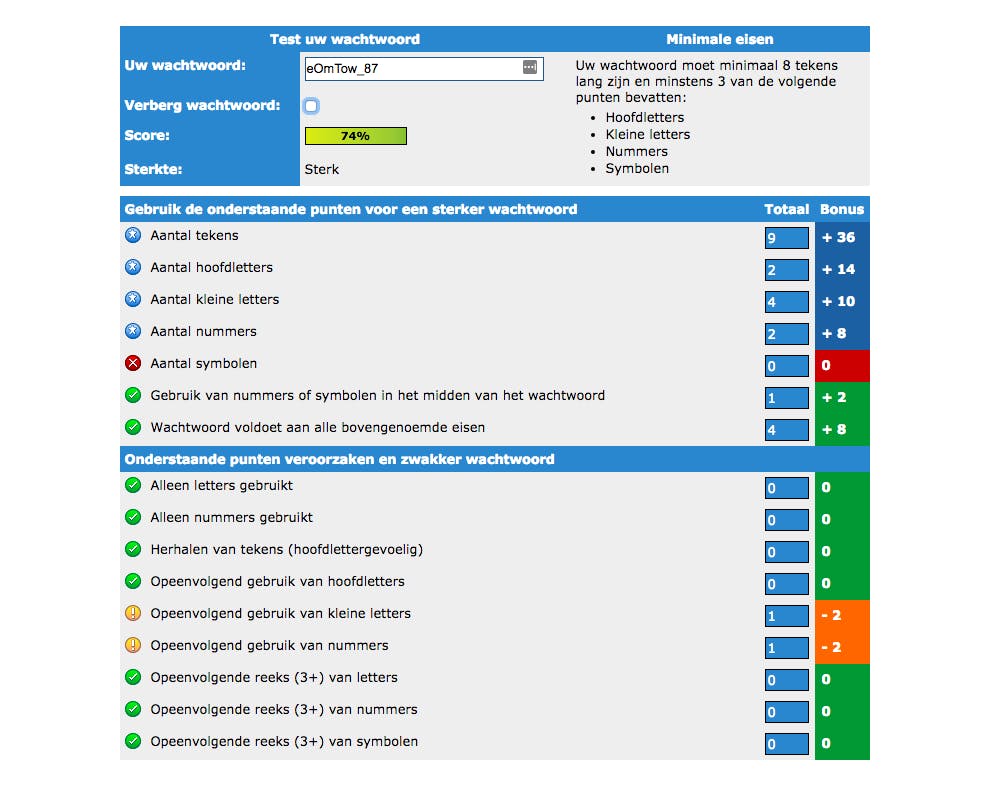 Voor een wachtwoord geldt hetzelfde als voor je tandenborstel: vervang hem elke zes maanden en geef hem aan niemand anders. Twijfel je of je wachtwoord sterk en uniek genoeg is, maak dan gebruik van een online wachtwoordtester. Hier voer je de code in, waarna je een score en advies krijgt. Ons voorbeeldwachtwoord ‘eOmTow_87’ heeft een score van 74 procent. Niet slecht, maar door ook symbolen toe te voegen en te voorkomen dat kleine letters en nummers elkaar opvolgen, maak je hem nét wat sterker. Houd er rekening mee dat een woord uit het woordenboek inclusief slechts een paar gewijzigde letters (bijvoorbeeld w4chtw00rd in plaats van wachtwoord) niet voldoende is. Hackers hebben vaak maar een paar minuten nodig om zo’n wachtwoord te kraken. Neem liever de eerste letters van de woorden in een makkelijk te onthouden zin als basis. Varieer met hoofdletters en kleine letters, wissel sommige letters om voor cijfers en voeg speciale tekens toe. Test daarna of je nieuwe wachtwoord sterk genoeg is. Zo maak je het zelfs ervaren cybercriminelen behoorlijk lastig.