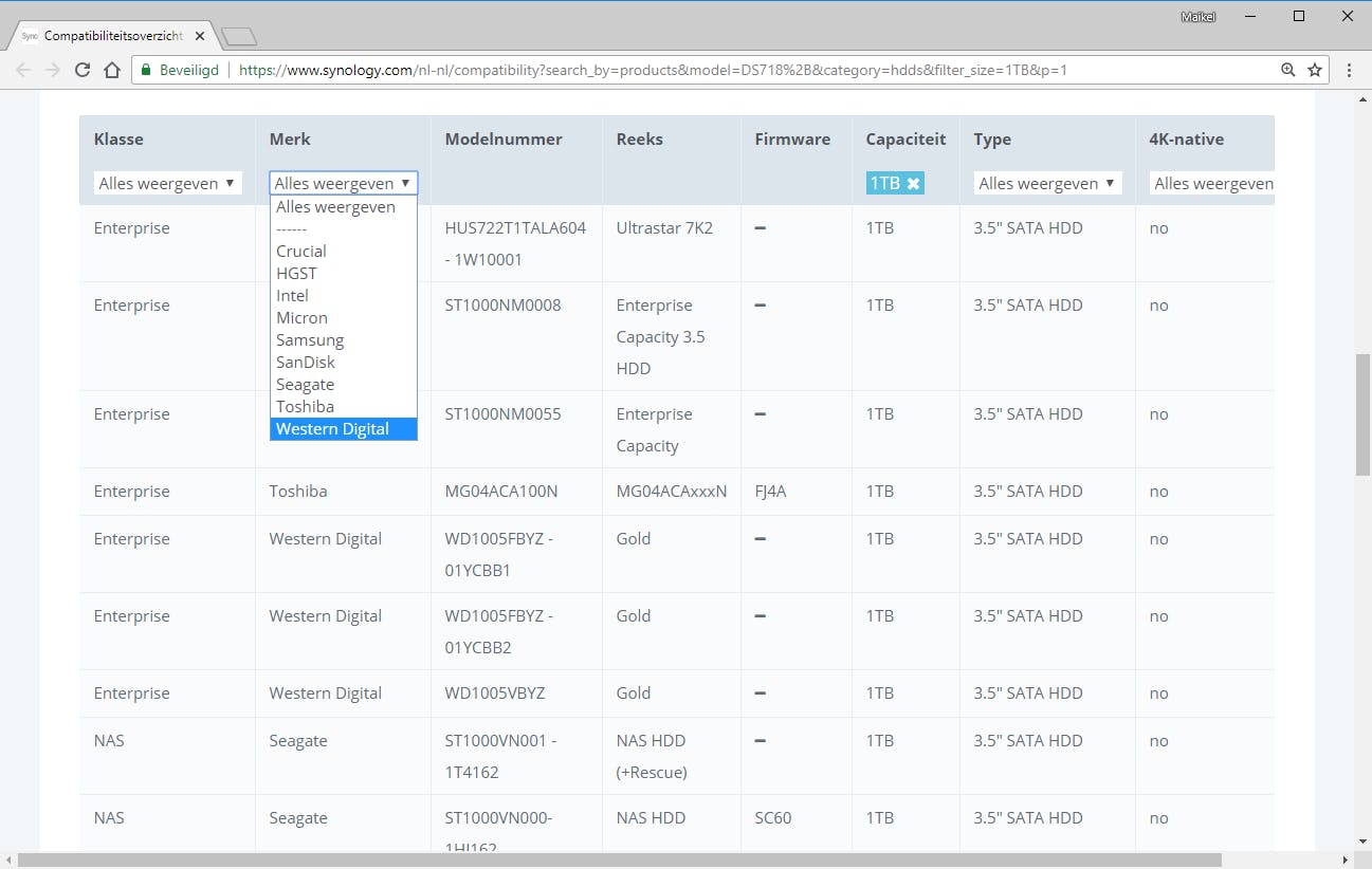 In bijna iedere nas passen zowel 2,5inch- als 3,5inch-schijven. De meeste fabrikanten leveren helaas zelf geen harddisks mee. Misschien heb je nog wat verloren opslagdragers liggen die je voor het back-upapparaat wilt gebruiken. Je kunt natuurlijk ook nieuwe schijven aanschaffen. Sommige schijven zijn speciaal voor een nas ontwikkeld. Dergelijke producten zijn stil en verbruiken weinig energie, waardoor ze geschikt zijn voor maanden- of zelfs jarenlange sessies. Om een lange levensduur te garanderen, proberen fabrikanten van nas-schijven hitteproductie en trillingen te beperken. Heb je schijven op het oog en wil je graag weten of jouw Synology-nas hiervoor geschikt is? Surf hiernaartoe en selecteer bij Find your Synology product het juiste typenummer. Bij Selecteer categorie kies je voor HDD/SSD. Via Apparaten zoeken verschijnt er een waslijst met geschikte opslagdragers. Controleer of de beoogde schijven staan vermeld. Je gebruikt eventueel de filters bovenaan de kolommen om te sorteren op merk en capaciteit.