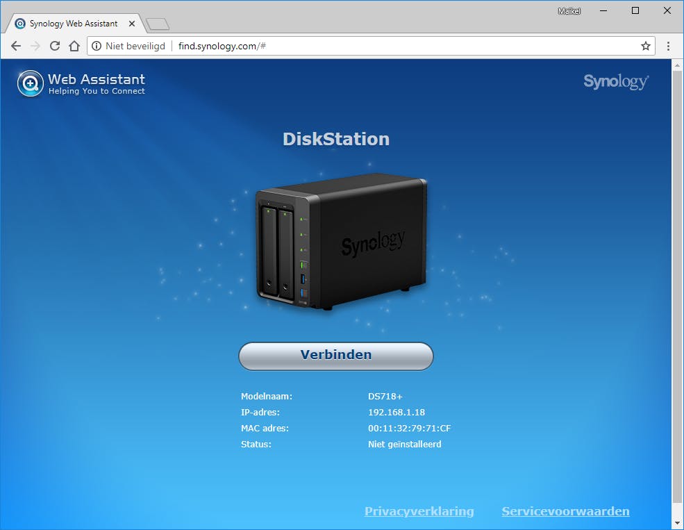 Het is hoog tijd om met je Synology-nas aan de slag te gaan. Je gaat als eerste het besturingssysteem DiskStation Manager (DSM) installeren. Dit besturingssysteem heb je nodig om de nas te bedienen. Schakel de nas in door op de aan-uitknop te drukken. Er gaat nu een lampje knipperen. Na even wachten hoor je een korte pieptoon. De nas is nu volledig opgestart. Open op een willekeurige computer binnen je thuisnetwerk een browser en typ het adres http://find.synology.com. Er verschijnt een blauwe pagina met een afbeelding van je Synology-nas en het bijbehorende ip-adres. Klik op Verbinden en ga op de volgende pagina akkoord met de voorwaarden. Via OK kies je achtereenvolgens voor Installeren / Nu installeren. Er verschijnt een waarschuwing dat je met deze handeling alle bestaande gegevens van de schijven verwijdert. Plaats een vinkje en bevestig met OK. Het duurt een paar minuten voordat DSM is geïnstalleerd.