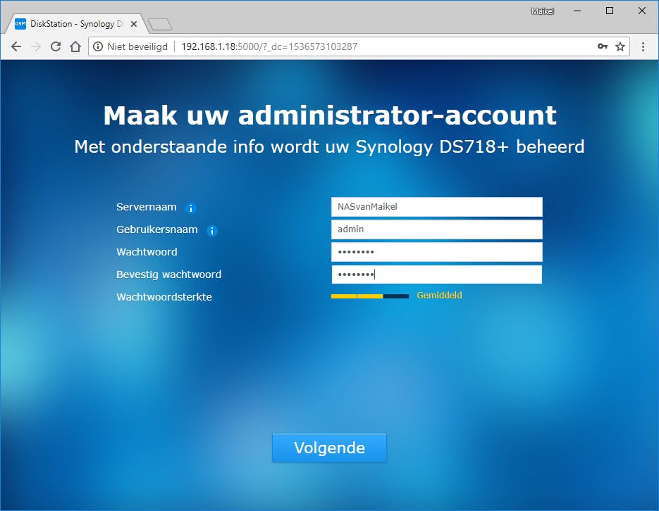 De administrator is kort gezegd de baas van de nas: degene die onder meer bepaalt welke andere gebruikers toegang tot de gegevens hebben en welke mappen er beschikbaar zijn in het netwerk. Voordat je de nas kunt gebruiken, maak je om die reden eerst een administrator-account aan. Na afloop van de installatie vraagt DSM daar zelf naar. Bedenk een herkenbare servernaam. Deze naam verschijnt onder meer wanneer andere apparaten verbinding willen maken. Vervolgens verzin je een gebruikersnaam en wachtwoord voor het administrator-account. Klik op Volgende.
