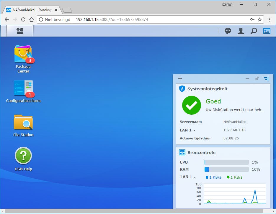 DSM vraagt allereerst of je de optie Apparaatanalyse wilt inschakelen. Synology verzamelt dan gegevens om naar eigen zeggen de gebruikersomgeving te verbeteren. Kies voor Ja of Overslaan. DSM geeft nu een korte rondleiding langs alle onderdelen. In het hoofdmenu bovenaan vind je alle functies, terwijl je het Package Center gebruikt om specifieke applicaties te installeren. Verder kun je alle instellingen vinden binnen het Configuratiescherm. Rechtsonder controleer je de status van het systeem, zoals de processor- en geheugenbelasting. Je gebruikt de pictogrammen rechtsboven onder meer om nieuwe meldingen op te vragen, de zoekfunctie te openen en het systeem netjes af te sluiten.