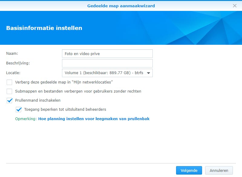 Het is verstandig om in ieder geval één gedeelde map op je nas in te stellen. Hiermee maak je de netwerklocatie bereikbaar voor overige apparaten, zoals een pc, tablet of smartphone. Open het onderdeel File Station. DSM geeft aan dat er nog geen gedeelde map beschikbaar is. Via OK verschijnt er een wizard. Bedenk een naam en vul eventueel een beschrijving in. Klik op Volgende en beveilig de map eventueel door een coderingssleutel op te geven. In de volgende stap duiken er nog meer geavanceerde functies op. Zo kun je onder meer een datalimiet voor de gedeelde map instellen. Via Volgende en Toepassen voeg je de gedeelde bestandslocatie definitief aan je nas toe. Er verschijnt een venster waarin je machtigingen kunt opgeven. Als administrator heb je automatisch lees- en schrijfrechten, dus je hoeft niets aan te passen. Sluit het venster met OK.
