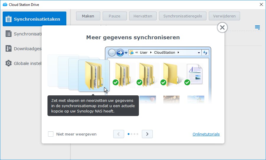 Je gaat nu een synchronisatiehulpje op de computer installeren. Surf hiernaartoe en selecteer in het uitrolmenu jouw Synology-nas. Alle beschikbare softwarepakketten verschijnen in beeld. Het programma Cloud Station Drive is beschikbaar voor Windows, macOS en Linux. Klik na de installatie op Nu starten. Via het QuickConnect ID en je inloggegevens maakt het programma verbinding met de nas. Wijzig via het potloodpictogram eventueel de maplocaties en start de synchronisatietaak met Voltooid.