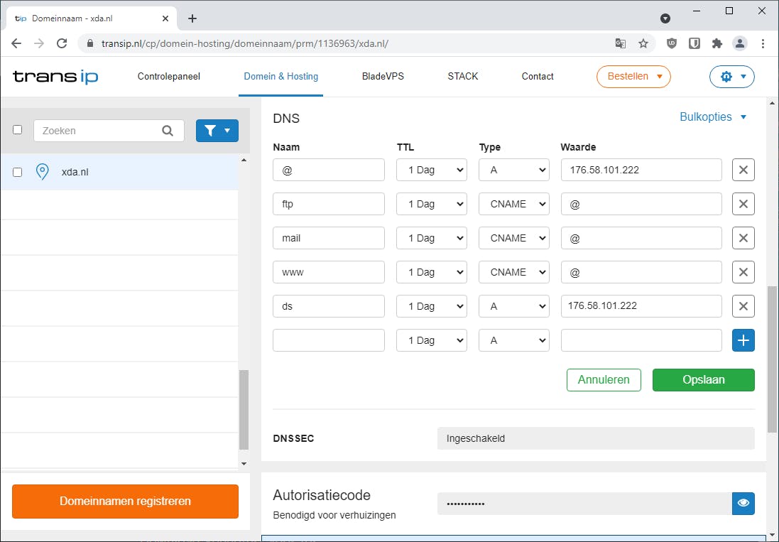 Wij gebruiken een domeinnaam bij domeinnaamregistratie- en webhostingbedrijf TransIP en gaan de DNS-instellingen aanpassen bij de hostingprovider via het controlepaneel. Voor het domein, in dit voorbeeld xda.nl, vullen we als naam de subdomeinnaam ds in, zodat de NAS via ds.xda.nl bereikbaar wordt. Het gaat om een A-record, waarbij we als waarde het ip-adres van de internetverbinding thuis invullen. Bewaar de aanpassingen. Het kan na een DNS-wijziging tot 24 uur duren voordat de wijzigingen merkbaar zijn, door caches van onder andere je internetprovider. Heb je geen vast ip-adres? Dan kun je dit bij veel providers op aanvraag regelen. Als alternatief kun je ook dynamisch DNS gebruiken, wat in veel routers en ook de Synology-NAS is ingebouwd. Het werkt zonder domeinnaam en kan ook met een dynamisch ip-adres overweg. Bij de NAS open je daarvoor Configuratiescherm. Ga naar Externe toegang / DDNS en klik op Toevoegen. Bij Serviceprovider kies je Synology. Voer een naam in bij Hostnaam. Hiermee zal steeds je ip-adres worden gekoppeld aan de bewuste naam (zoals naam.synology.me).