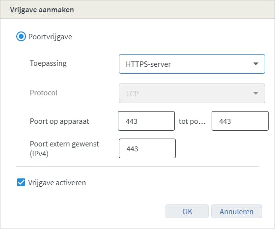 Voor het maken van certificaten en bereiken van je NAS via internet moet je enkele poorten doorsturen vanaf je router. Onderstaande instructies zijn voor een AVM Fritz!Box, bij andere routers werkt het net wat anders. Open de gebruikersinterface en ga naar Internet / Toegang verlenen. Op het tabblad Poortvrijgaven kies je Apparaat voor vrijgaven toevoegen. Kies als apparaat de reverse proxy (je NAS of een aparte server) of voer handmatig het ip-adres in. Kies dan Nieuwe vrijgave. Nu kun je bij Toepassing direct de gewenste optie kiezen, zoals HTTP-server of HTTPS-server. Kies eerst HTTP-server. Je ziet dat zowel bij Poort op apparaat als Poort extern gewenst de waarde 80 wordt ingevuld (dat is de standaardpoort voor http-verkeer). Bij de optie HTTP-server is dat poort 443. Voeg ze beide toe zodat respectievelijk poort 80 en 443 worden doorgestuurd. Gebruik je een NAS, dan kun je met de optie Andere toepassing ook poort 5001 doorsturen voor de gebruikersinterface.
