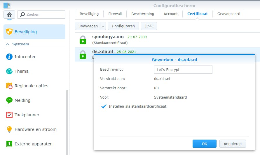 Het is verstandig om het nieuwe Let’s Encrypt-certificaat hierna nog als standaardcertificaat in te stellen. Op die manier zetten we het Synology-com-certificaat buitenspel, dat (door de browser) als onveilig wordt beschouwd. Klik daarvoor weer op het Let’s Encrypt-certificaat en klik op het pijltje bij Toevoegen / Bewerken (bij DSM 7.0 Actie / Bewerken). Zet een vinkje bij Instellen als standaardcertificaat en klik op OK.