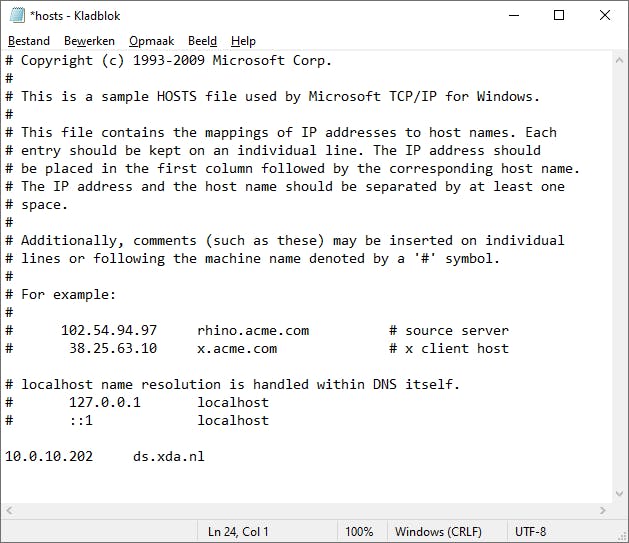 Wil je dat het internetadres (ds.xda.nl) direct naar het ip-adres van de NAS verwijst? Zonder eigen DNS-server? Dan kun je dat eventueel op de clients zelf instellen. Onder Windows gaat dat via het hosts-bestand. Open daarvoor de map C:\Windows\System32\drivers\etc. Kopieer het bestand hosts naar een bestandslocatie waar je dit mag bewerken. Open het met bijvoorbeeld Kladblok en voeg een regel toe met het ip-adres van de NAS gevolgd door de domeinnaam, bijvoorbeeld: 10.0.10.202ds.xda.nl Kopieer het bestand weer terug naar de genoemde locatie. Als je nu https://ds.xda.nl:5001 bezoekt, dan word je direct naar de NAS in het lokale netwerk gebracht. Het certificaat blijft geldig, het ip-adres heeft daar geen invloed op. Via de Opdrachtprompt kun je met ping ds.xda.nl of nslookup ds.xda.nl controleren dat het lokale ip-adres wordt gebruikt. Een DNS-server is praktischer, omdat het meteen voor elk apparaat in je netwerk werkt, als je de DNS-server kenbaar maakt via DHCP.