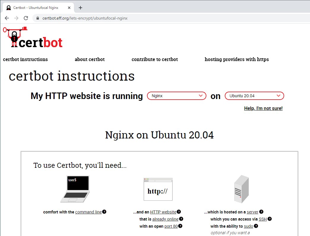 Bezoek het ip-adres van de server en controleer of de welkomstpagina van Nginx verschijnt. Voor het maken van Let’s Encrypt-certificaten gaan we Certbot gebruiken. De instructies voor de installatie voor jouw webserver en besturingssysteem vind je hier. Die instructies gaan bij Ubuntu uit van een installatie via Snap. Hier kiezen we voor de mogelijk iets oudere versie van Certbot uit de repository’s van Ubuntu. Je installeert Certbot met het commando: