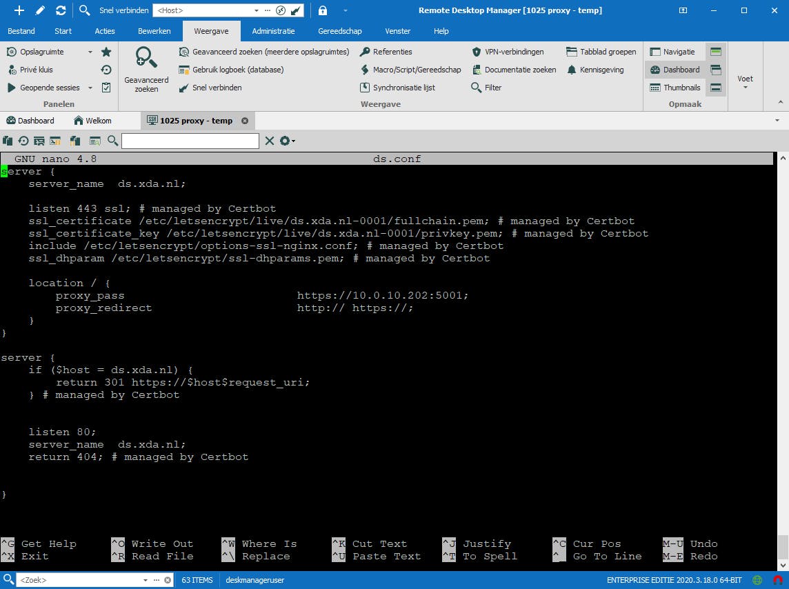 Als laatste stap moeten we alleen nog de regels voor de reverse proxy hieraan toevoegen. Er zijn twee blokken omsloten door server {}. Het onderste blok bevat de doorverwijzing van http naar https. In het bovenste blok voegen we aan de onderkant de volgende regels toe. Achter proxy_pass zet je uiteraard het adres van je NAS.