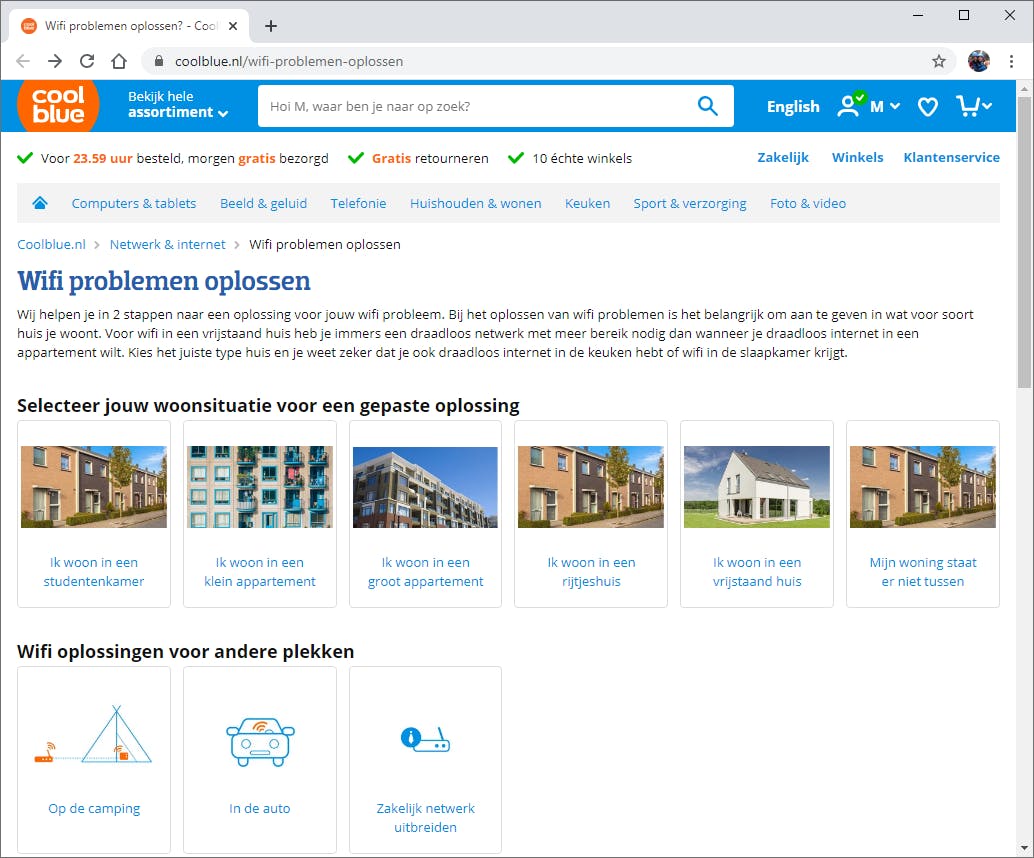 Sommige webwinkels helpen hun klanten aan de hand van een keuzehulp om een passende wifi-oplossing te vinden. Je geeft bijvoorbeeld eerst aan dat je in een appartement, rijtjeswoning of vrijstaand huis woont. Bepaal in de volgende stap waarvoor je het wifi-netwerk voornamelijk gebruikt en zie geschikte netwerkproducten verschijnen.