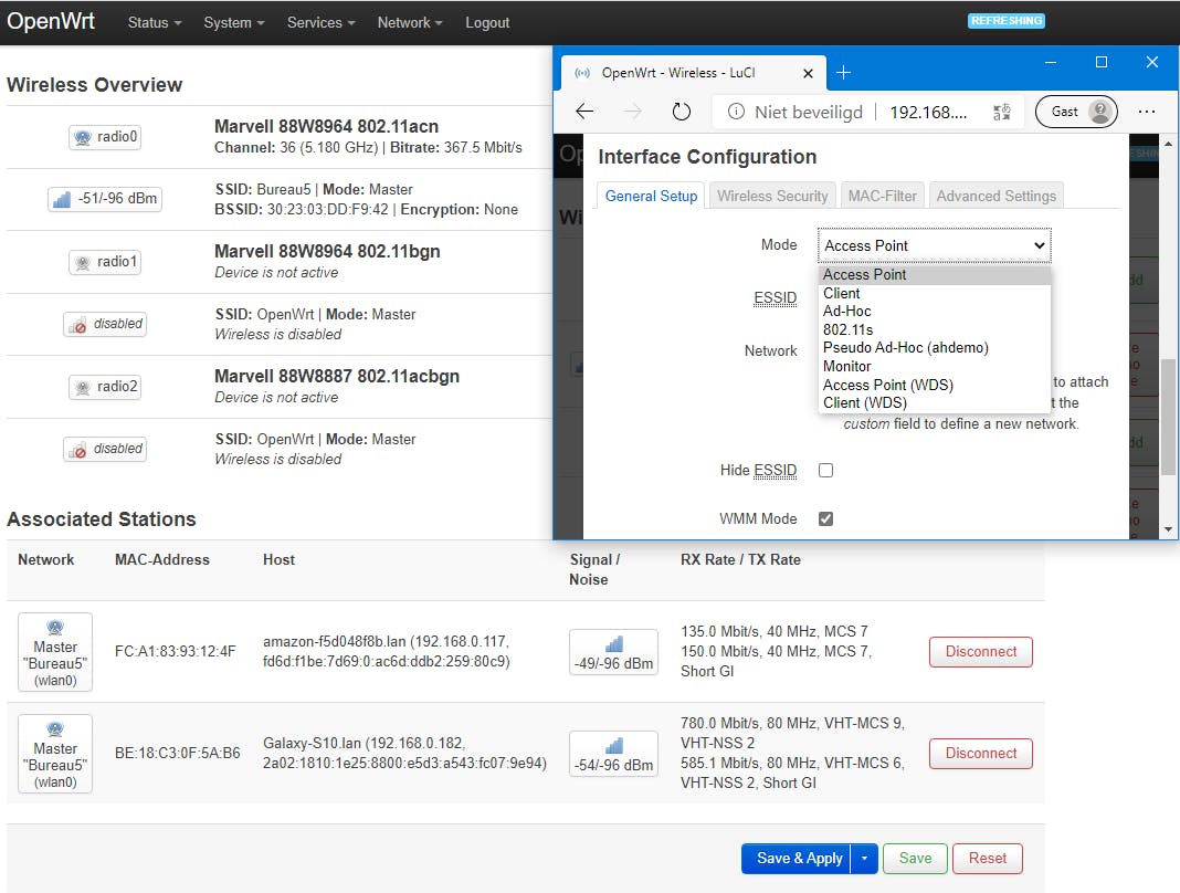 Je vindt hier vertrouwde opties terug zoals Channel en Width, maar bijvoorbeeld ook Maximum transmit power. Bij Interface Configuration, op het tabblad General Setup, kun je uit maar liefst acht modi kiezen, waaronder Access Point (standaard), 802.11s (voor een mesh-netwerk) en Monitor (om het wifi-verkeer te kunnen monitoren).