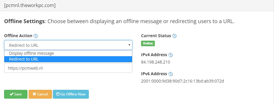 Bij DDNS Settings vind je trouwens nog andere instellingen terug. We beperken ons hier tot een paar opties. Via Offline Settings kun je zelf een url of een boodschap opgeven die de bezoeker te zien krijgt wanneer je server offline blijkt. Via de knop Go Offline Now kun je het resultaat meteen uittesten (desnoods moet je eerst nog even je browsercache leegmaken). Vergeet daarna niet weer Go Online Now te selecteren.
