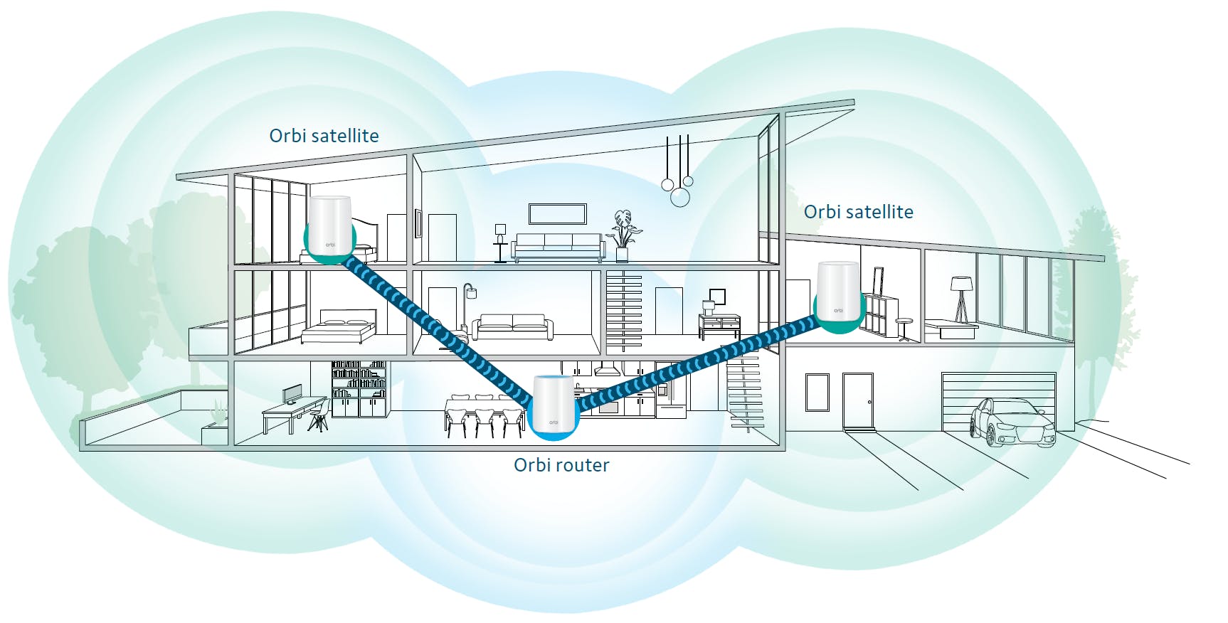 Fabrikanten noemen hun wifi-systemen ook wel mesh-systemen. Mesh slaat op de eigenschap dat alle nodes in het systeem onderling verbinding kunnen maken. Een verbinding tussen nodes kan hierdoor potentieel via meerdere routes worden gelegd. In de basis geldt dat hoe meer nodes je plaatst, hoe beter het mesh-netwerk zal functioneren. Nu is dit voordeel van meerdere nodes wel deels theoretisch, want thuis zul je doorgaans werken met een router aangevuld door twee draadloze accesspoints. In de praktijk wordt het hierdoor mogelijk dat een signaal vanuit de router naar een accesspoint via een ander accesspoint doorgegeven kan worden. Zo kan een signaal naar zolder doorgeven worden via een node op de eerste verdieping. Fabrikanten beloven dat, hoewel een signaal meerdere ‘hops’ moet maken, de snelheid toch goed blijft. Linksys’ Velop en Ubiquiti’s AmpliFi HD ondersteunen een mesh-configuratie. Netgears Orbi niet, want de satellieten kunnen alleen direct communiceren met de router. Hiermee werkt Orbi enkel in een zogenoemde sterconfiguratie. Netgear heeft wel aangegeven te werken aan communicatie tussen de satellieten onderling.