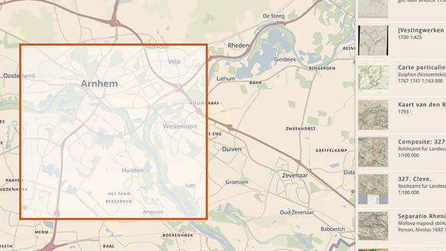 Door op zo’n historische kaart te klikken, krijg je informatie over het tijdstip en de makers. Bovendien markeert de webapp de omtrek van de historische landkaart op de moderne kaart. Daarna kun je de historische kaart openen en erop inzoomen.