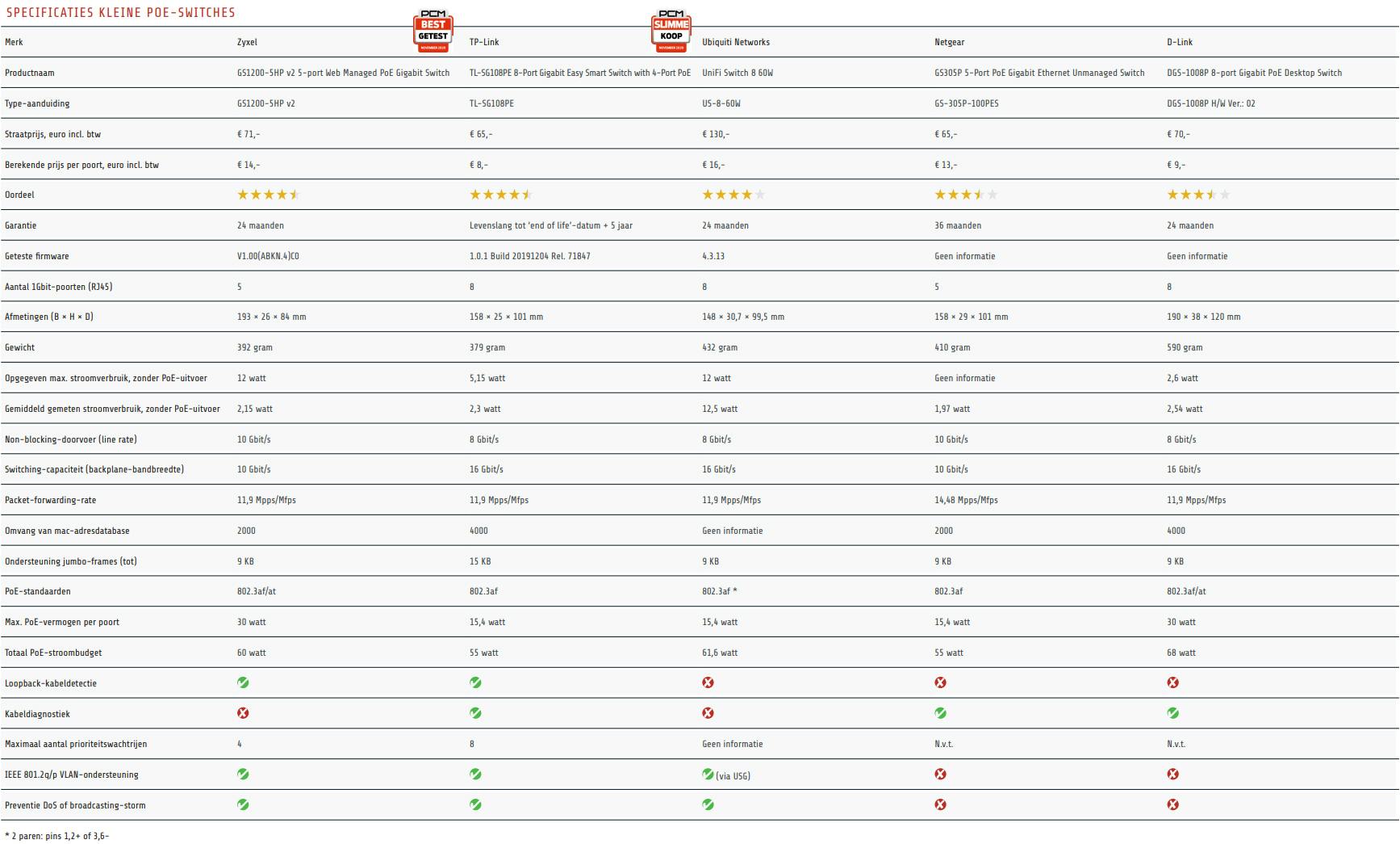 Daarnaast geven we punten op ruim tachtig verschillende technische criteria, variërend van de grootte van de geheugenbuffer voor het schakelen van pakketten, over de ondersteuning van allerlei standaarden tot criteria zoals het geproduceerde lawaai en het maximale wattage per PoE-poort. Met deze cijfers berekenen we een gewogen oordeel en komen we uit op een sterrenscore.