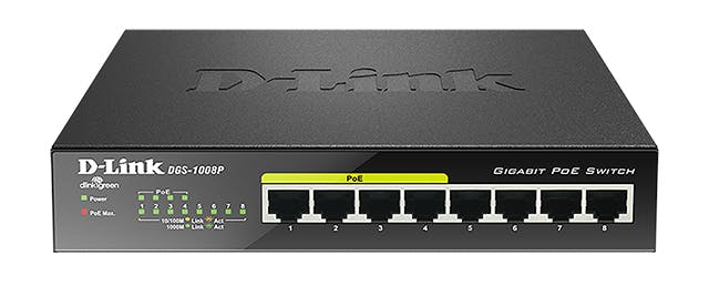 De helft van de poorten van deze stevig gebouwde desktop-switch leveren elektriciteit via de netwerkkabel volgens de IEEE 802.3af en -at-standaarden. Dankzij de ondersteuning voor de recentere at-standaard (ofwel PoE+) kan de DGS-1008P via een gewone cat5-kabel bijna twee keer zoveel energie leveren als een PoE-type-1-switch met alleen 802.3af, namelijk 30 watt in plaats van 15,4 watt.