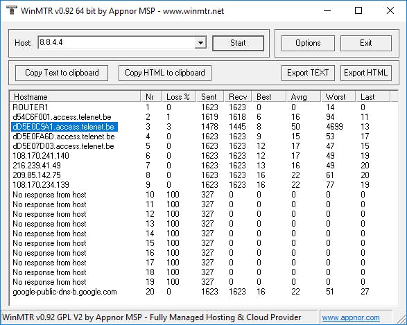 Er zijn tools die nog grondiger te werk gaan of die je meer informatie kunnen bezorgen. Eén ervan is het al wat oudere MTR (My TraceRoute), beschikbaar voor diverse platformen. MTR is goed vergelijkbaar met pathping, maar de gebruiker bepaalt zelf hoe vaak de route (opnieuw) wordt getraceerd. Je krijgt bij elke router onder meer de gemiddelde round-trip-time en het percentage pakketverlies te zien.