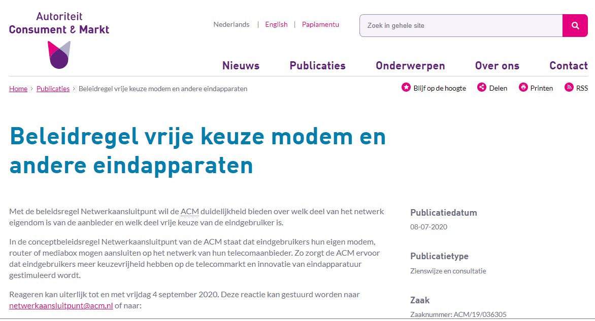 Dit duurde uiteindelijk tot juli 2020, toen de ACM zijn conceptbeleidsregel netwerkaansluitpunt publiceerde. De ACM verwachtte toen dat de regel in 2021 van kracht zou worden, maar vervolgens werd het stil. Begin juli kwam de ACM met een tussentijdse update waarin de verwachting werd uitgesproken dat de beleidsregel deze zomer gepubliceerd gaat worden. Dat duurde niet lang, want al op 27 juli publiceerde de ACM hun Beleidsregel Handhaving Besluit Eindapparaten die je hier vindt.