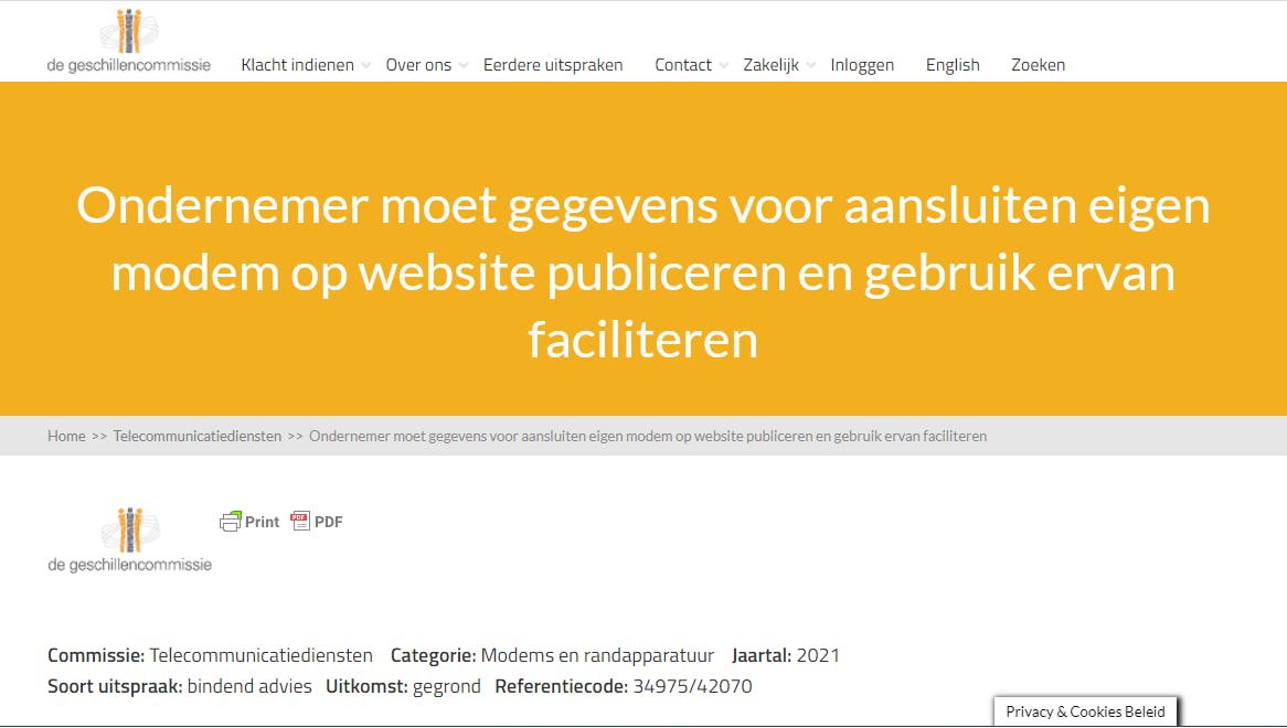Een klant van Ziggo was het hier niet mee eens en spande eind 2020 een zaak aan bij de Geschillencommissie Telecommunicatiediensten. De Geschillencommissie heeft vooral gekeken naar de Europese regelgeving waaronder de eerder genoemde BEREC-richtlijn. Ook is rekening gehouden met het feit dat het in Duitsland en Italië al mogelijk is eigen apparatuur te gebruiken. Ziggo kon niet goed beargumenteren waarom dit vanuit een objectief technologische noodzaak niet zou kunnen, waarna de Geschillencommissie de klant in het gelijk stelde. Het oordeel was dat Ziggo binnen 21 dagen moest publiceren hoe een eigen modem/router op de coax-aansluiting aangesloten kan worden.
