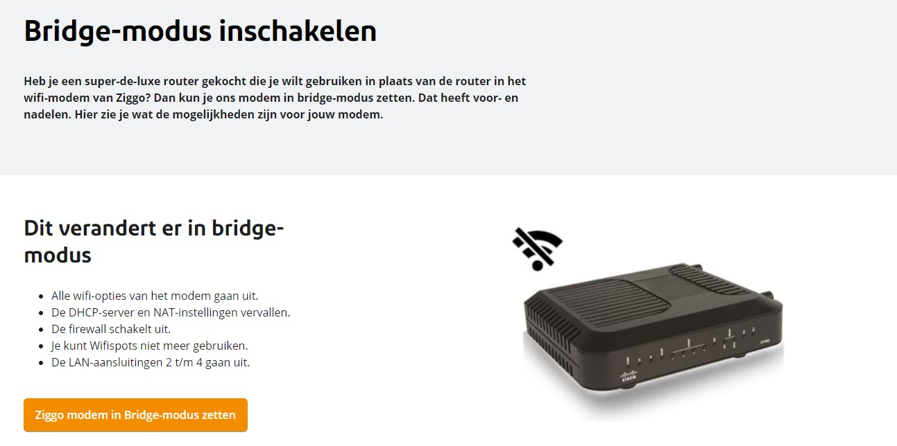 Volgens VodafoneZiggo is het Ziggo-modem integraal onderdeel van het netwerk en vervult het een essentiële functie binnen het Ziggo-netwerk. Ook wordt het modem uitgebreid getest en regelmatig bijgewerkt met software-updates. “Wanneer klanten zouden kunnen kiezen welke modems zij op het netwerk willen aansluiten, brengt dit de continuïteit, veiligheid en integriteit van het netwerk in gevaar”, meldt een woordvoerder van VodafoneZiggo ons. Het enige dat de internetprovider wel aanbiedt, is een bridge-modus waarmee de modem/router enkel als modem fungeert.