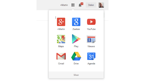 Een ander deel is verplaatst naar rechts. Wanneer je kijkt naar je profielnaam rechtsboven, dan zie je daarnaast een pictogram met negen vierkantjes. Wanneer je daarop klikt, dan vouwt er een menu uit met daarin de inhoud van de voormalige zwarte balk en meer. Kortom, de zwarte balk is er nog, maar simpelweg anders ingedeeld.