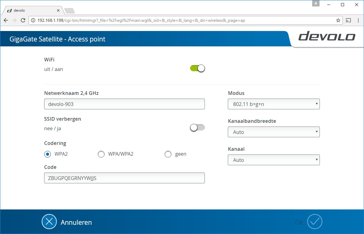 Daarnaast heeft Devolo in de satellite een 802.11n-accesspoint op de 2,4GHz-band ingebouwd dat gebruik maakt van twee datastromen voor een maximale snelheid van 300 Mbit/s. In de base zit geen wifi-accesspoint. GigaGate is volgens devolo dan ook geen wifi-systeem of vervanging van je router. De Base bevat geen routermogelijkheden en wifi-accesspoint omdat je de base volgens devolo doorgaans zult aansluiten op je draadloze router die beide functies al heeft. Zowel de Bridge als de Satellite hebben een webinterface die je kunt gebruiken om instellingen aan te passen en de firmware bij te werken. Je kunt bijvoorbeeld de ssid van het wifi-netwerk aanpassen om het netwerk hetzelfde te maken als je normale draadloze netwerk.