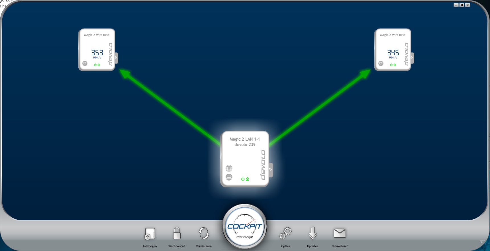 De gegevens van het bestaande wifinetwerk kopieer je desgewenst van je bestaande router naar de devolo-kit zodat alles hetzelfde wachtwoord en dezelfde netwerknaam gebruikt. Dit kan via een druk op de knop (wps-functie), of met behulp van de app. Lukt de automatische configuratie onverhoopt toch niet, dan kan je de verbinding ook manueel in orde brengen. Hoe dat moet staat uitgelegd op pagina 41 van de installatiegids, die ook Nederlandstalig is.