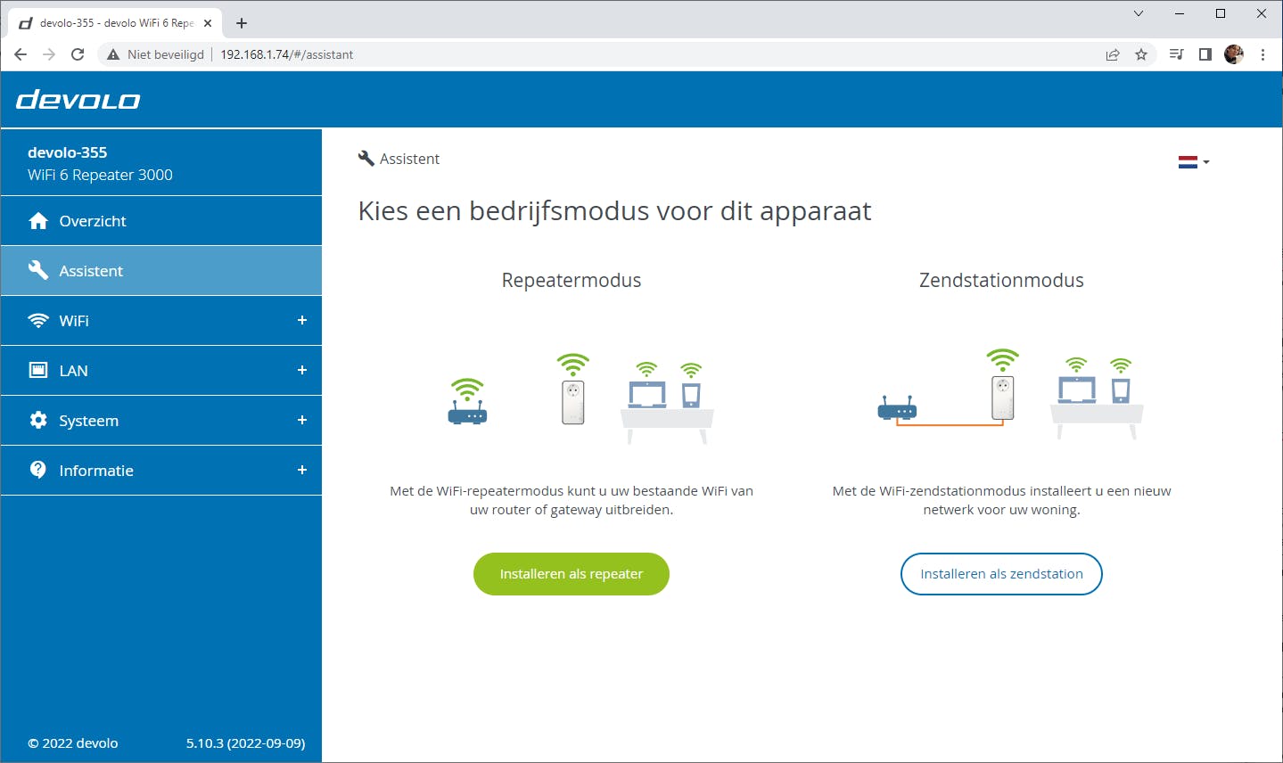 Het installeren van de repeater is eenvoudig en omhelst in sommige gevallen niet meer dan het indrukken van het wps-knopje. Dat werkt uiteraard alleen als wps op je router is ingeschakeld. Als je wps op je router hebt uitgeschakeld, dan kun je de repeater koppelen via de webinterface of een app voor iOS of Android. De app geeft na installatie toegang tot basale instellingen zoals veranderen van de netwerknaam, voor de uitgebreide instellingen wordt de webinterface geopend. Wanneer je meerdere Devolo-repeaters hebt, dan kun je die vanuit dezelfde app beheren.