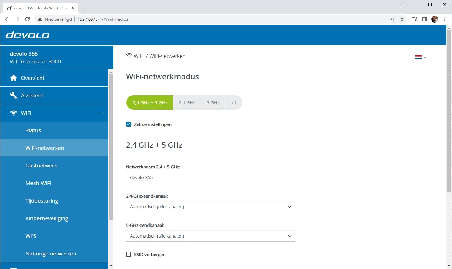 Wanneer je de Devolo WiFi 6 Repeater 3000 als accesspoint wilt inzetten, dan kun je dat in de webinterface selecteren. Vervolgens stel je zelf een ssid in, dat kan uiteraard dezelfde zijn als je bestaande netwerk. In accesspointmodus kun je indien gewenst zelf kanalen kiezen en eventueel het gebruik van dfs-kanalen uitschakelen.